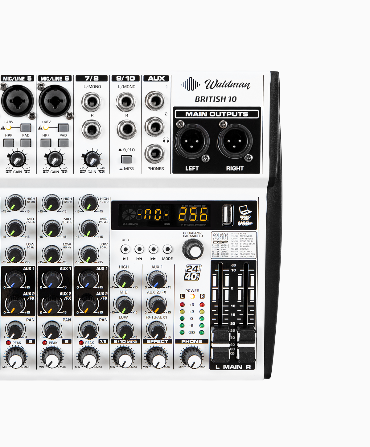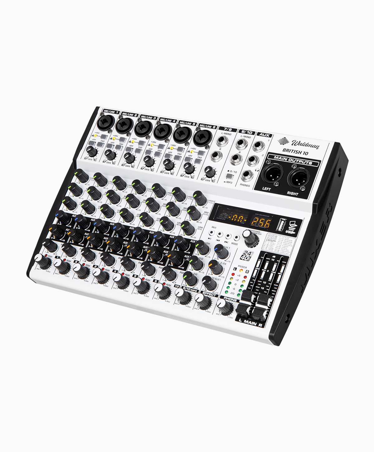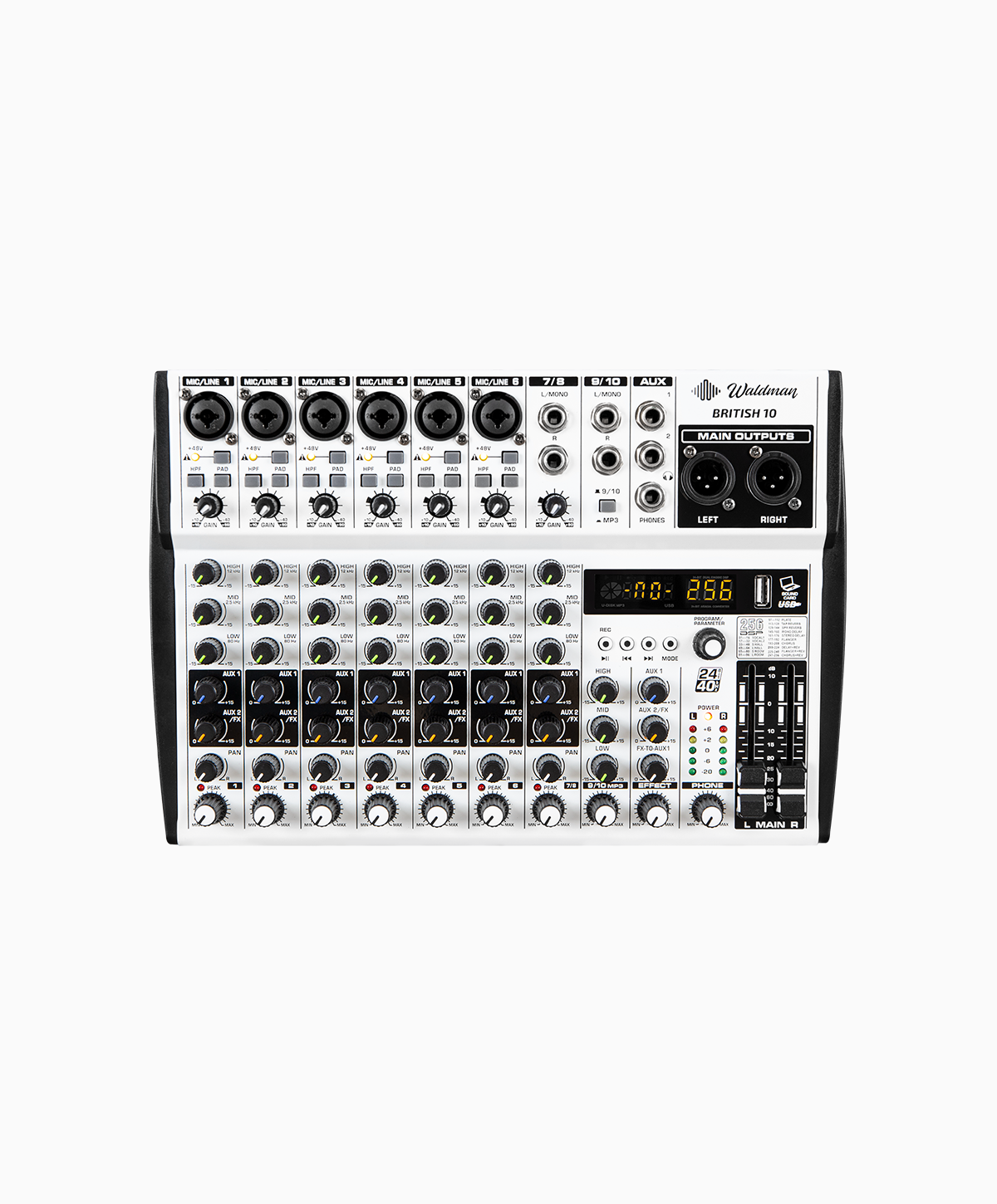 Mais canais, mais controle. A British 10 oferece 6 entradas mono com Phantom +48V, 2 canais estéreo, DSP 24-bit com 256 efeitos e USB player. Ideal para igrejas e bandas completas.