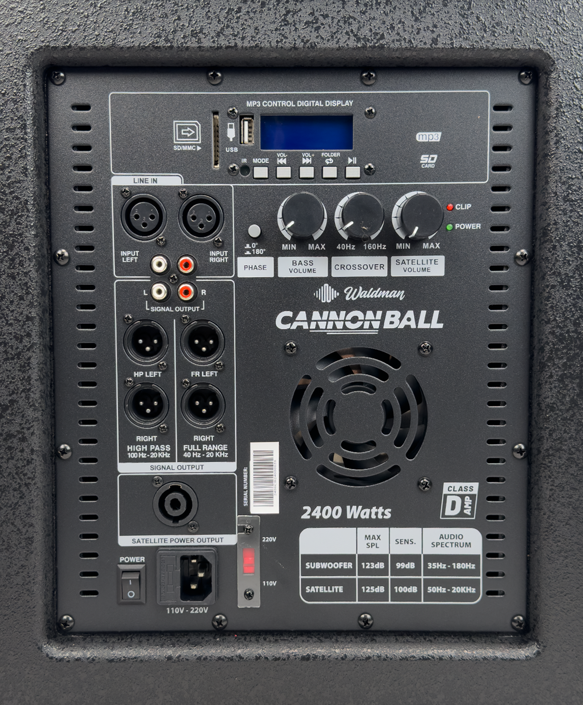 O Waldman Cannon Ball 2400 é um sistema ativo 2.1 com subwoofer de 12” e 2400W de potência de pico. Conta com Bluetooth 5.0 com TWS, USB, SD e FM. Ideal para DJs, eventos e festas que exigem graves potentes e alta pressão sonora.