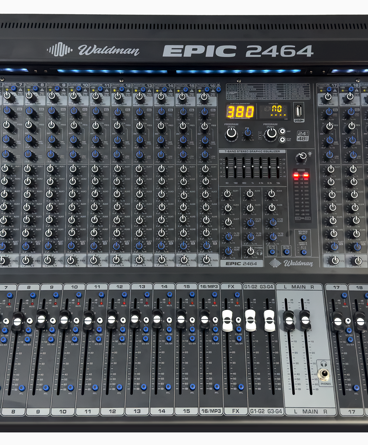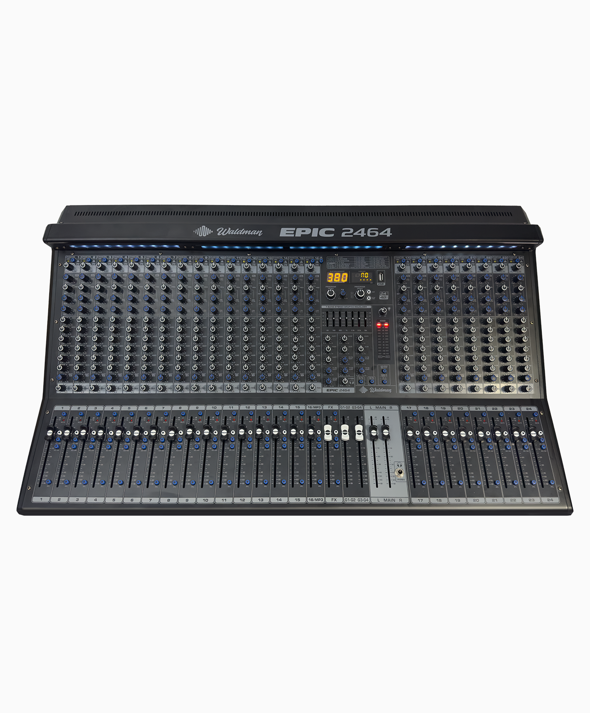 A Waldman EPIC 2464 é a escolha ideal para bandas completas, igrejas com múltiplas fontes, grandes eventos e produções profissionais que exigem ampla capacidade de entrada e controle absoluto da mixagem.