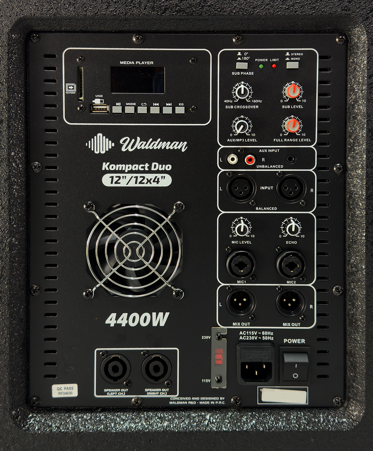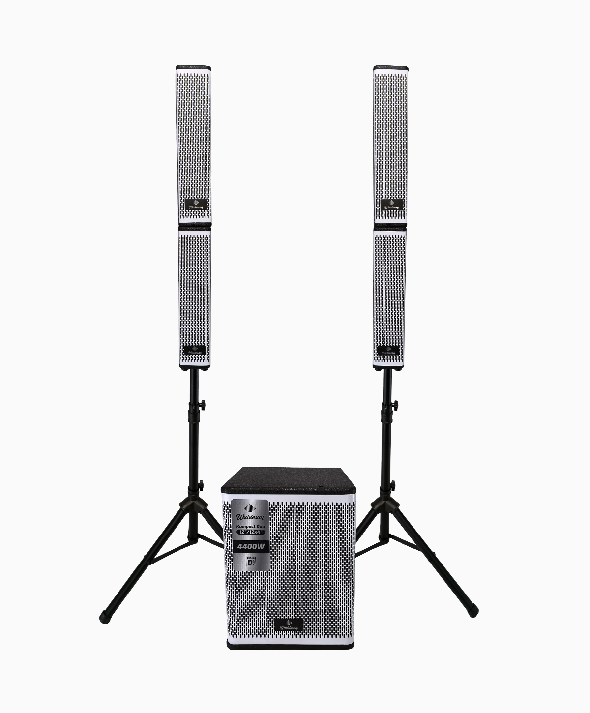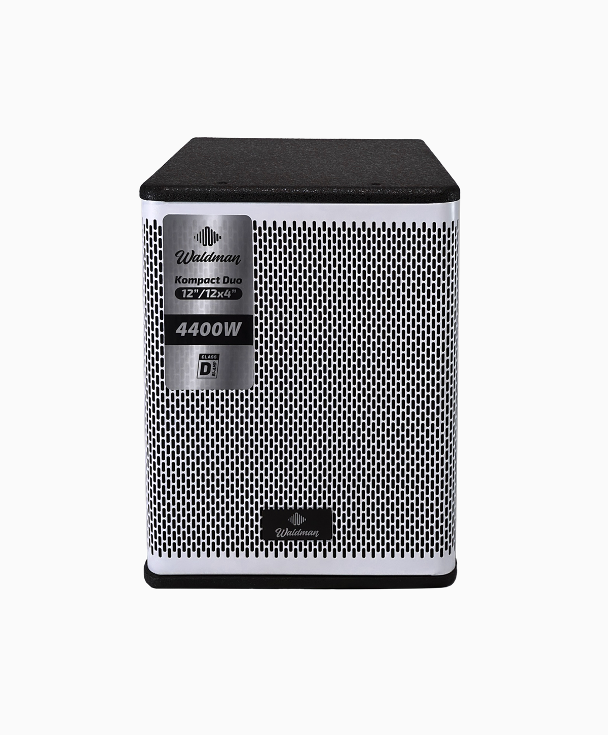 O Waldman Kompact Duo 12124 é um sistema ativo 2.1 composto por subwoofer de 12” e coluna com 3 alto-falantes de 4” + driver de 1”, entregando definição e graves consistentes.