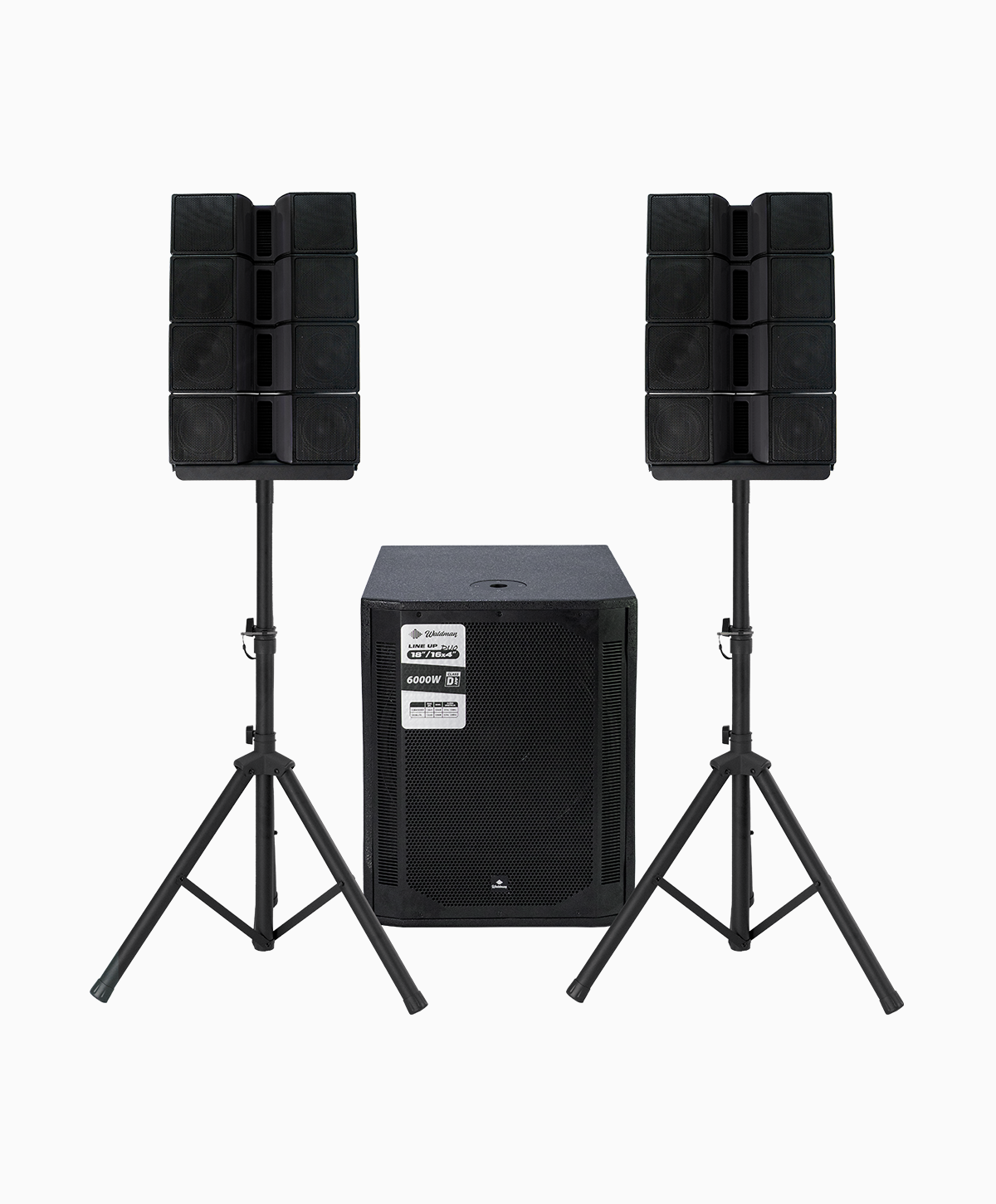 Com 6000W de potência, combina subwoofer de 18” com duas colunas totalizando 16 alto-falantes de 4” + drivers de 1”, proporcionando ampla cobertura e alta pressão sonora.