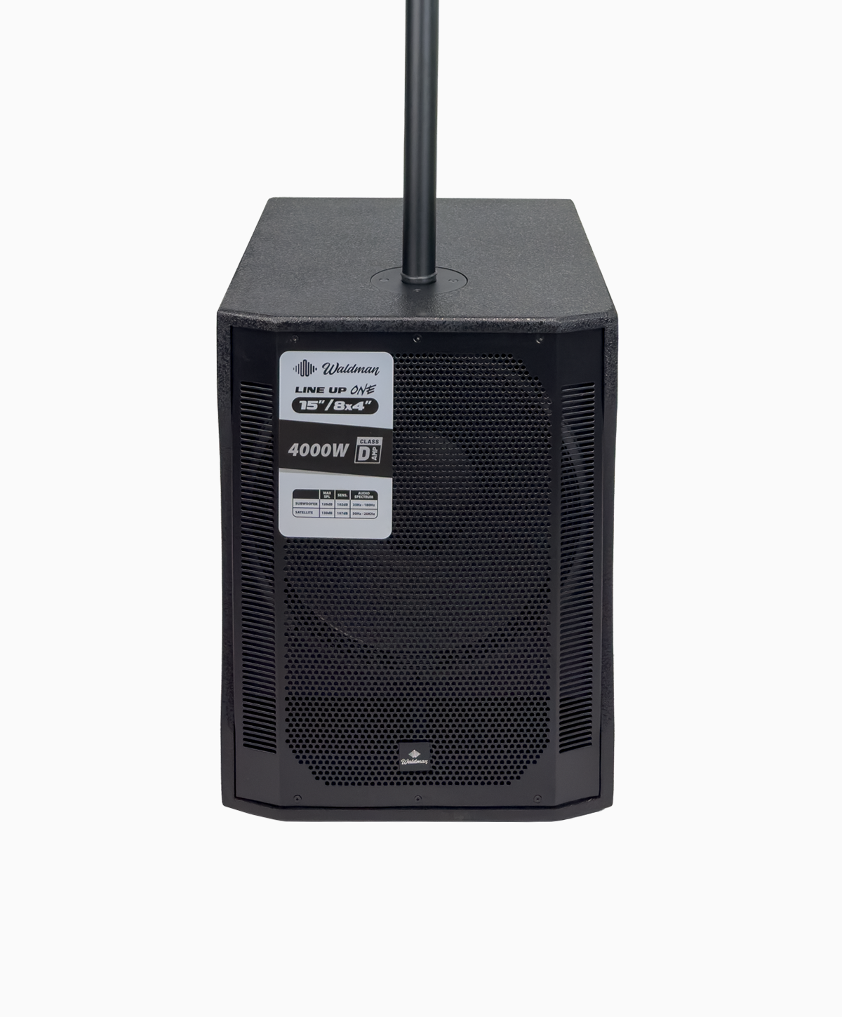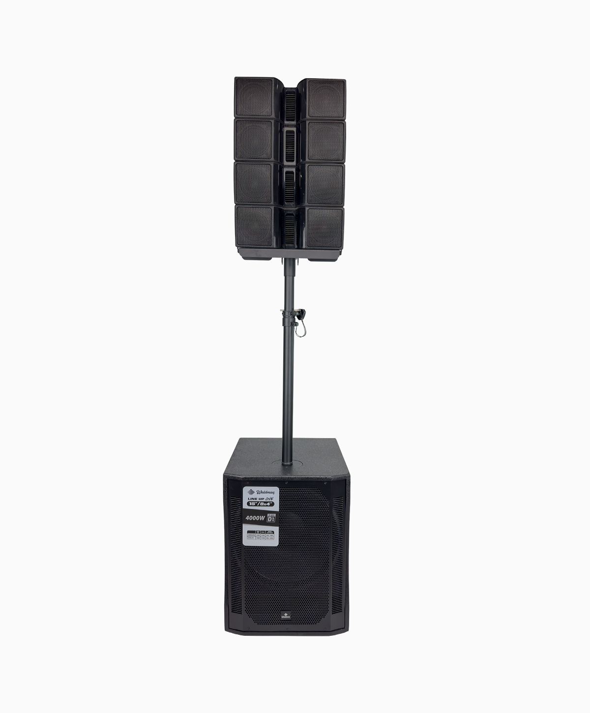 O Waldman Line Up One 1584 entrega 4000W de potência com subwoofer de 15” e coluna 4×4”, Bluetooth 5.0 TWS e controle avançado de fase e crossover.