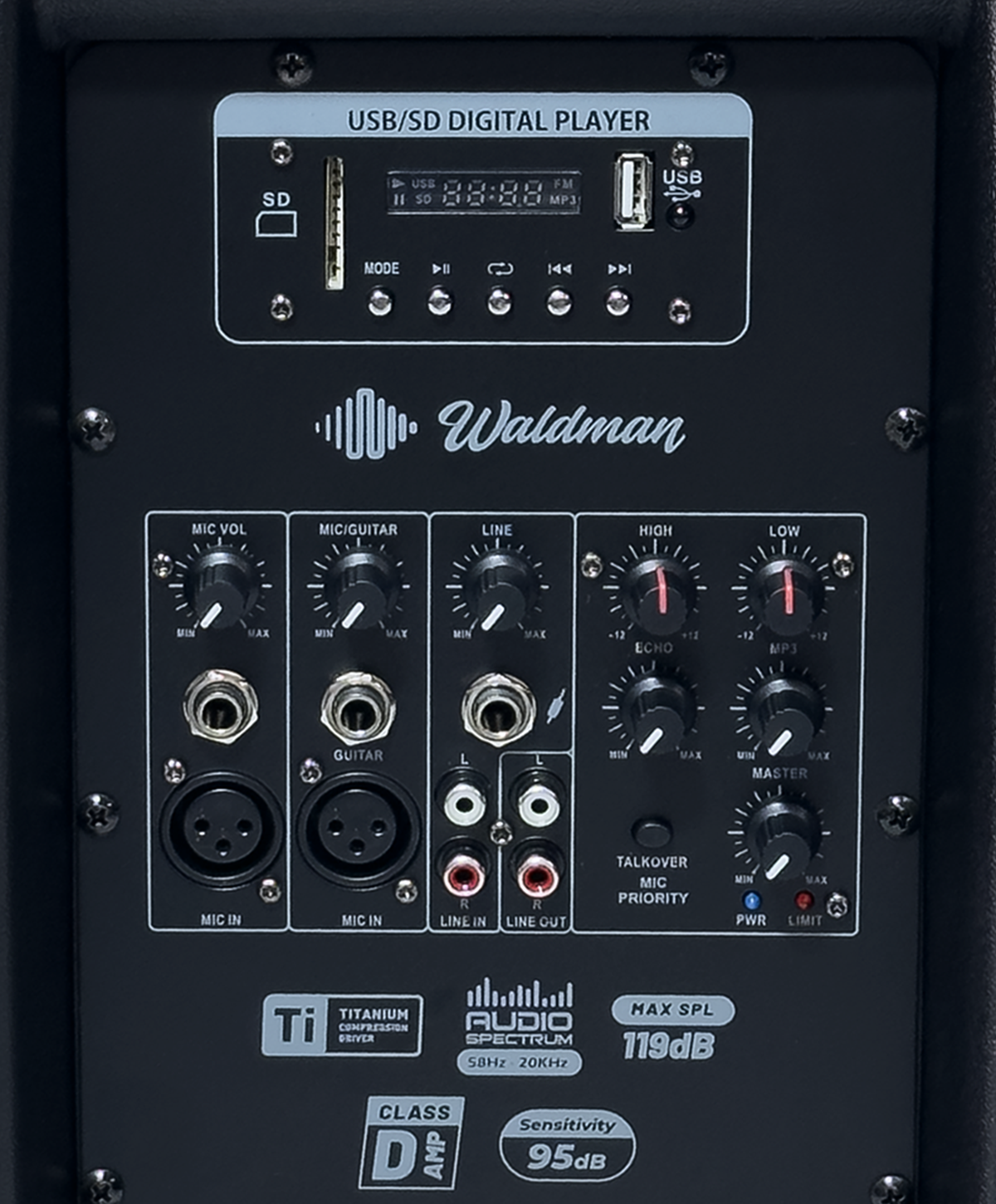 A Waldman Party Cab 700 é uma caixa ativa de 15” com 700W de potência máxima, Bluetooth, USB/SD, FM e TWS. Ideal para festas, igrejas e eventos, oferece entrada para microfone e guitarra, efeitos de eco e som potente com excelente presença.