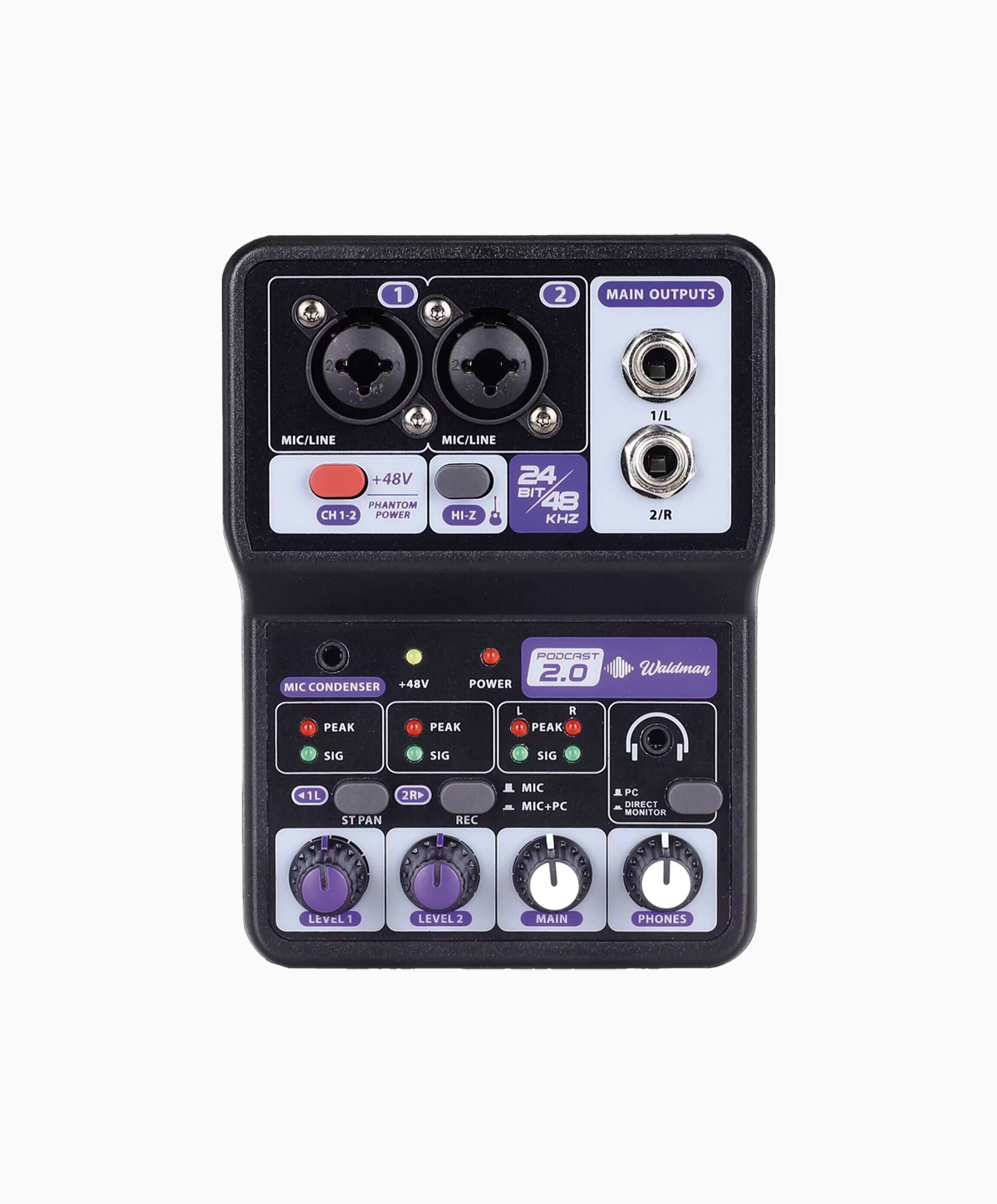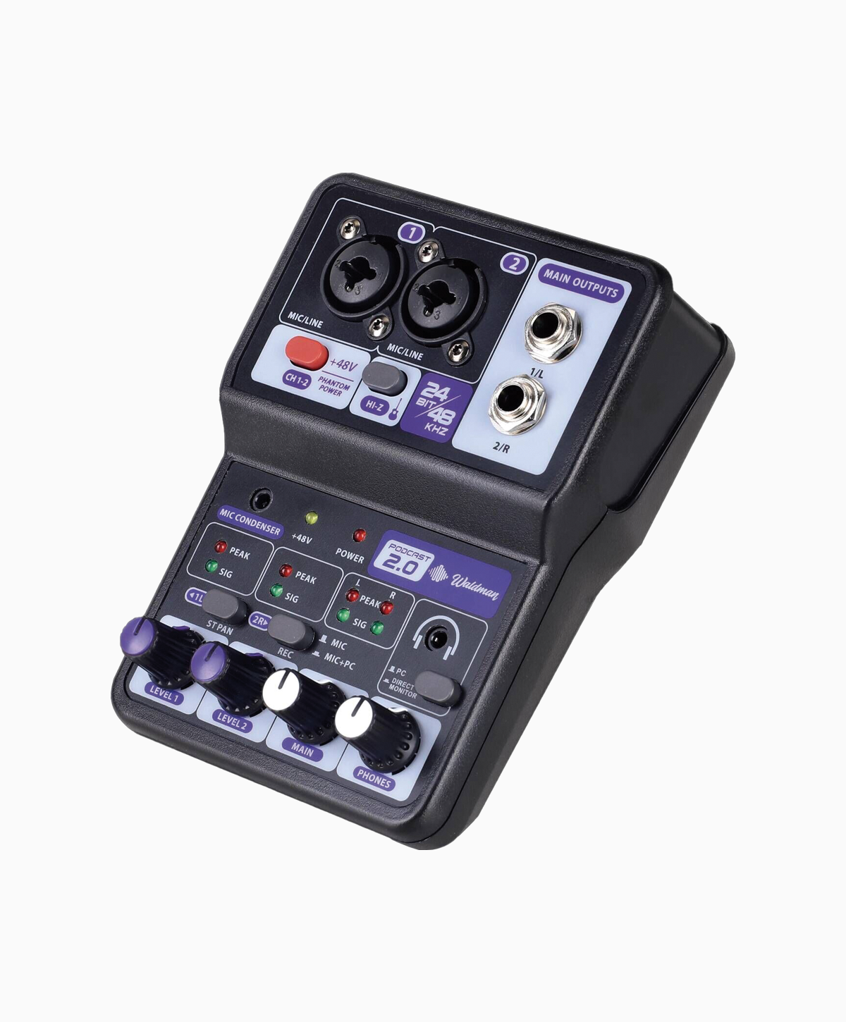 A Waldman Podcast 2.0 é uma interface de áudio USB/mixer com 2 entradas combo XLR/P10, phantom power 48V, monitoramento por fone e gravação em 16-bit/48kHz. Ideal para podcasts, lives, streaming e produção de conteúdo com qualidade profissional.