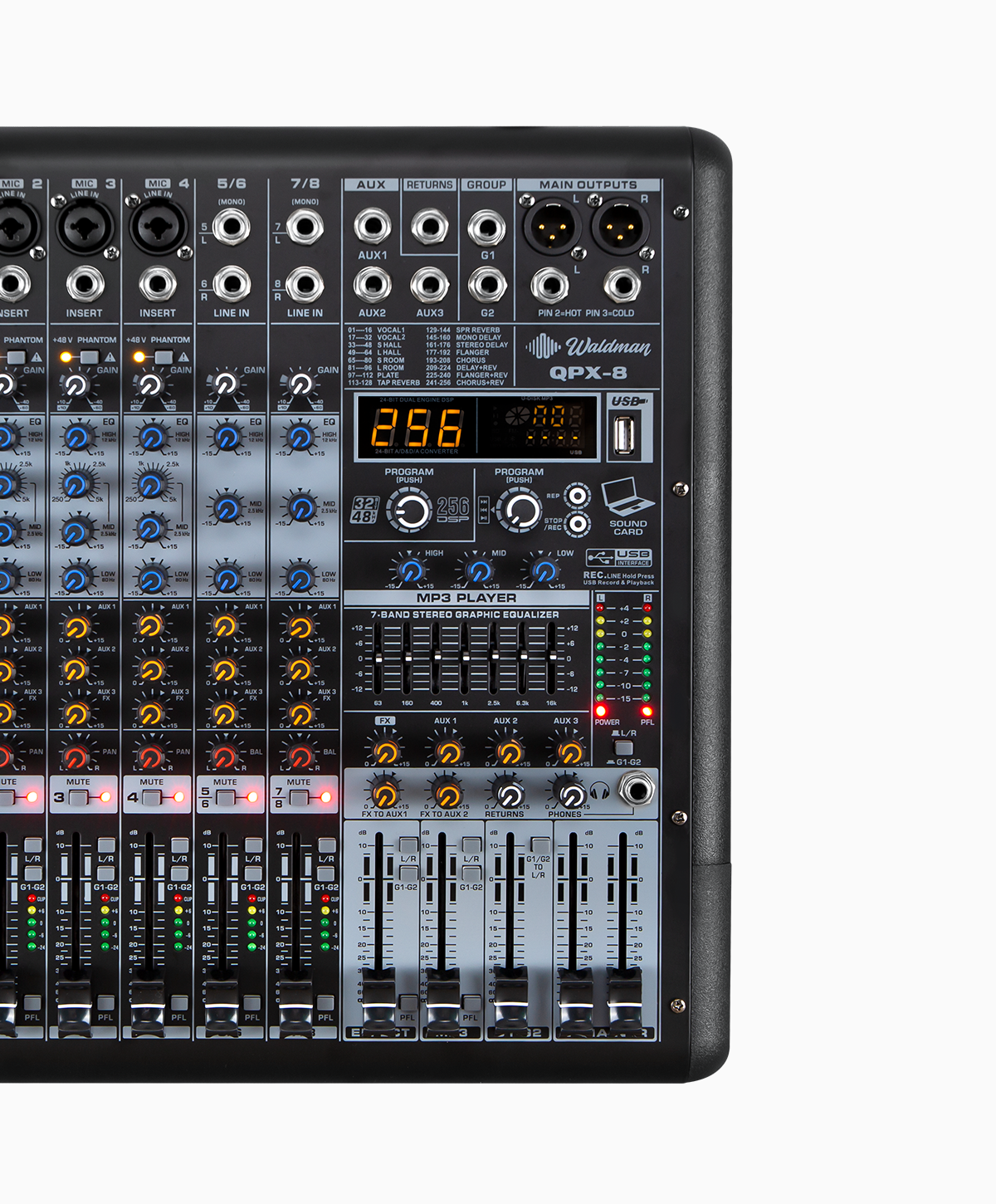 Seu processamento digital oferece DSP 32-bit com 256 presets de efeitos, gravação e reprodução via USB, Bluetooth integrado e equalizador gráfico de 7 bandas na saída principal.